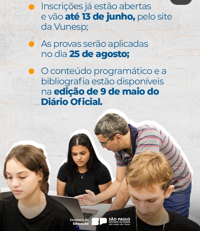 Informamos que o Edital de Abertura de Inscrições do Processo Seletivo Simplificado para contratação docente – 2026, foi publicado em Diário Oficial do Estado edição de 9 de maio de 2025 Caderno Executivo – Seção Atos de Gestão e Despesas.