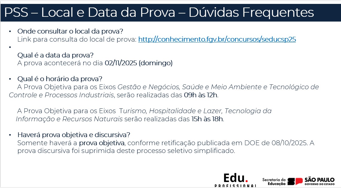No próximo domingo, 02/11, serão aplicadas as provas objetivas, de caráter eliminatório, referentes ao Processo Seletivo Simplificado para contratação temporária de docentes da Educação Profissional Técnica da SEDUC-SP.